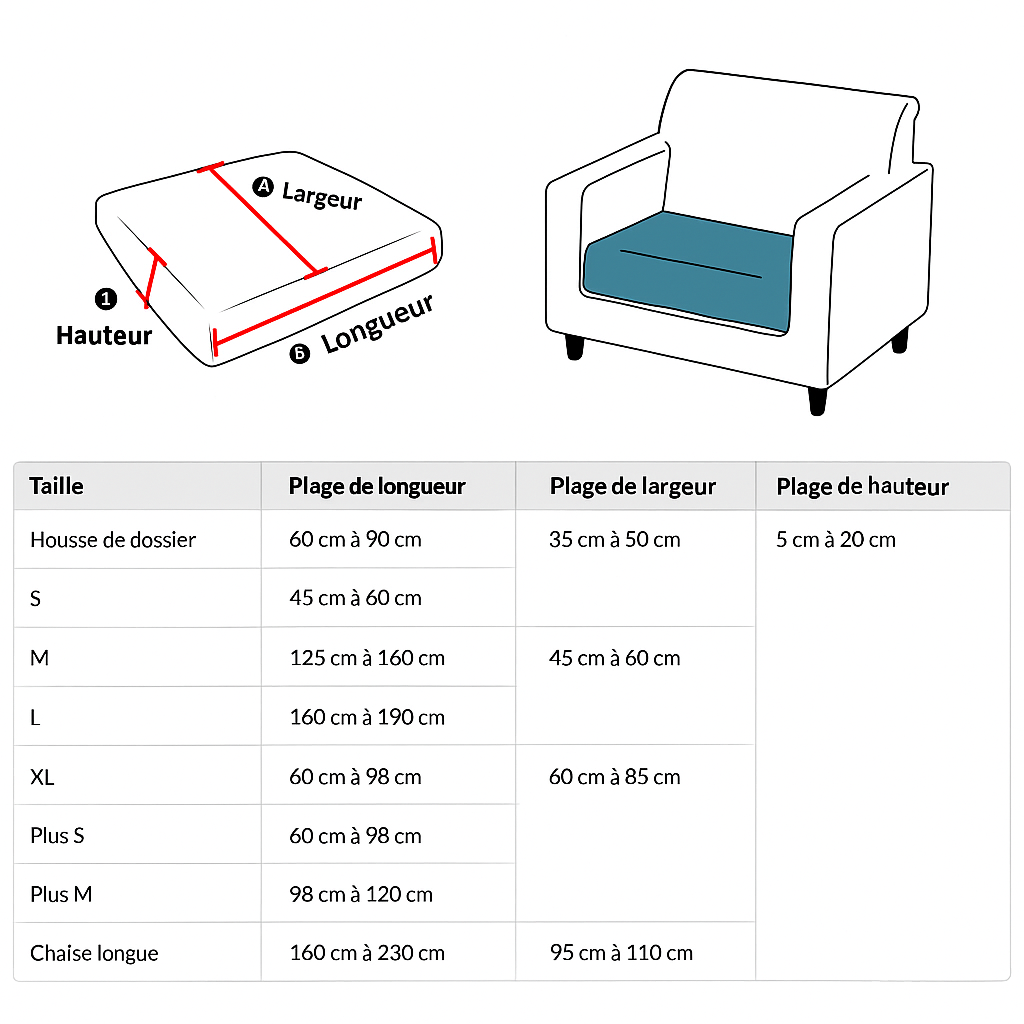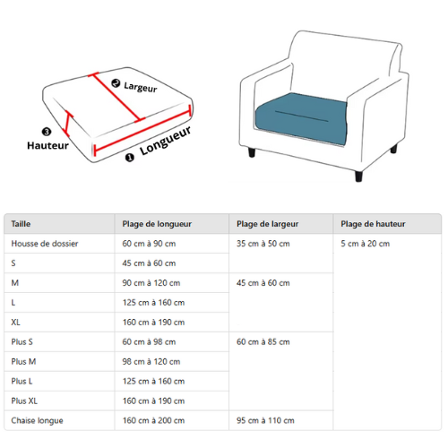 La Housse de Canapé Jacquard HOUSSELLE est disponible dans différentes tailles allant de S à XL, ainsi qu'une option Chaise Longue pour répondre à vos besoins spécifiques. Il est recommandé de mesurer avec précision les dimensions de votre canapé pour choisir la taille adéquate.
